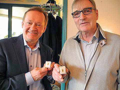 Eero Raappana (vas.) ja Mauri Sinisalo saivat klubin kultaisen pinssin.